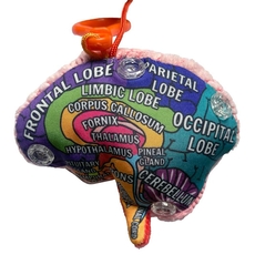 Take brain power on the go! This adorable Brain Model key chain is a soft, detailed cross-sectional model of the human brain - half labeled, half blank for study and review. The interior features vibrant artwork highlighting major brain regions, while the outer shell is beautifully embroidered. Snaps keep the two halves securely connected so you can explore the brain wherever you are.