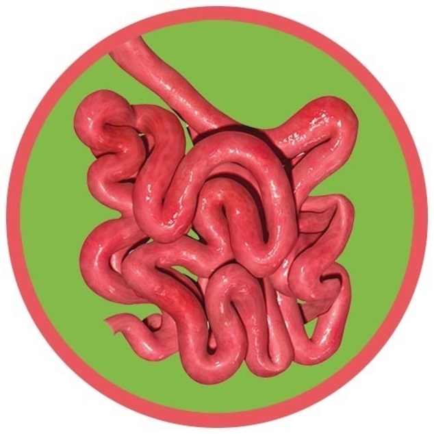 Churned food travels from the stomach into the long, convoluted small intestine. The first section is 12" long and its name, duodenum, means "12 each".