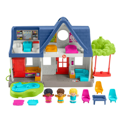 - Electronic Little People home playset with 3 best friend figures and 7 additional play pieces; folds for storage