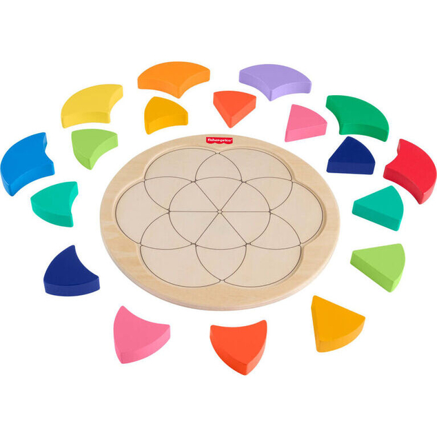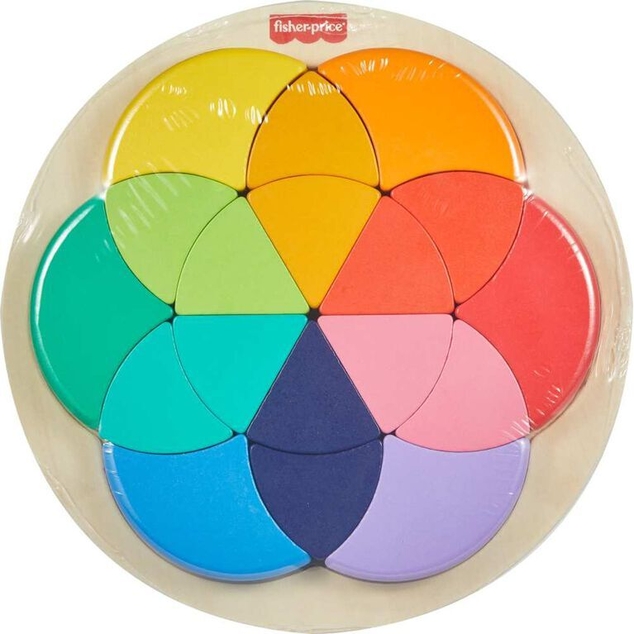 Kids can explore color mixing and matching through fun shape-sorting play with this Wooden Color Wheel Puzzle from Fisher-Price. Made with wood from Forest Stewardship Council-certified sources (FSC-N004566), this 18-piece puzzle features brightly colored chunky pieces decorated with non-toxic, water-based paint and designed just right for small hands to grasp and place into the tray. Etched guidelines on the storage tray help kids sort each shape piece into its corresponding slot for rewarding independent play. Colors and decorations may vary.