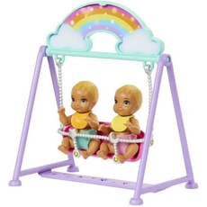 It's double the fun and cuteness with this Barbie twinning nursery playset! Skipper -- the teenage sister of Barbie -- has two of everything to babysit the twin dolls, both wearing removable diapers. There's a crib for two that really rocks, a rainbow swing with a seat for the twins, a bouncing baby see-saw, and a play arch that can fit on the crib or used on the ground. With additional accessories like bottles, blankets, bibs, toy trains, and teddy bears, Skipper has everything she needs to take care of the adorable twins! Doll cannot stand alone. Colors and decorations may vary.