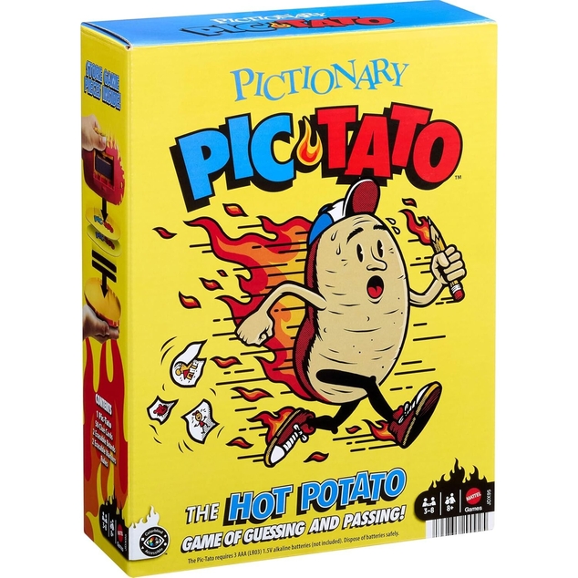 Draw it like it's hot with Pictionary Pic-Tatoa twist on the classic family drawing game. The Pic-Tato plays music as players draw clues. After a clue is guessed, the Pic-Tato says which way to pass so another player can draw a new clue. Each correct guess is worth points and the player with the most points when the music ends, wins! But don't be the one left holding the Pic-Tato!