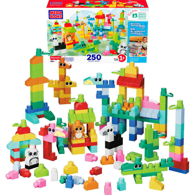 Toddlers can build and discover the wonderful world of animals with the MEGA BLOKS Animal Blocks building toy. They can match and stack the blocks to build a lion, giraffe, bird, and much more. When playtime is over, blocks can be stored inside the included reusable storage bag for easy cleanup.