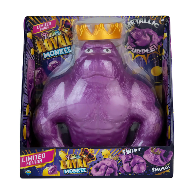 All hail the Funkee Monkee Royal! The glittering, metallic monarch of our viral Funkee Monkee line — with over 6 billion TikTok views — this jumbo edition is nearly 5 pounds of stretchy, squishy, poseable fun. Twist, smush, and shape the crowned king into endless hilarious expressions, making it a show-stopping fidget toy for kids and collectors alike. Regal, viral, and utterly irresistible, the Royal Monkee rules the shelf and your social feeds!
