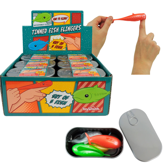 The Toysmith Fin Fish Flingers set delivers classic finger-flinging fun in a compact, collectible format. Each reusable tin holds four different colored fish flingers, bringing variety and visual appeal to every play session.