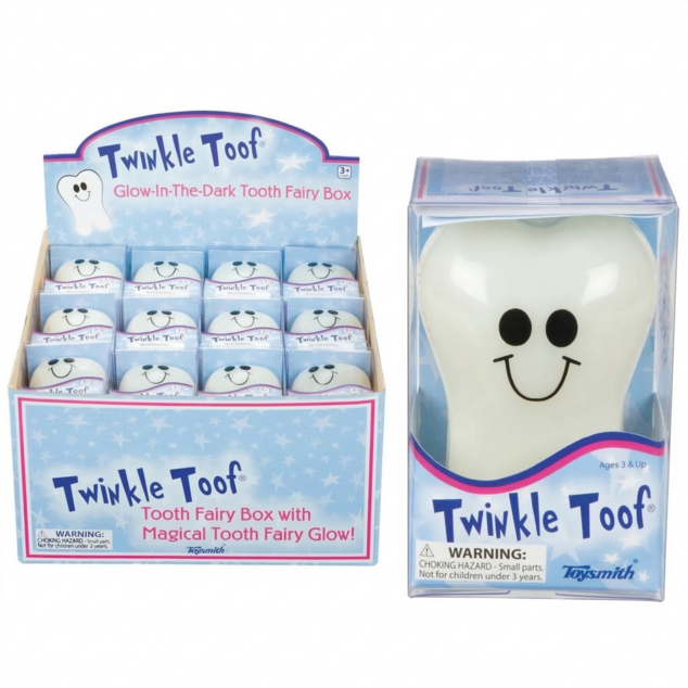 The Toysmith Twinkle Toof Tooth Fairy keepsake box is popular with both parents and kids. Made with nontoxic plastic, this glow-in-the-dark tooth keeper is small and sturdy. This 3.5-inch tooth-shaped box features soft black eyes and an easy smile. A side latch opens it up to reveal a black velvet inside to keep kids’ teeth safe. A secret compartment folds out for putting teeth in, along with a clip to hold money. Each Twinkle Toof keepsake box also glows in the dark. Get a light blue display box of 24 Twinkle Toof Tooth Fairy keepsake box toys.
