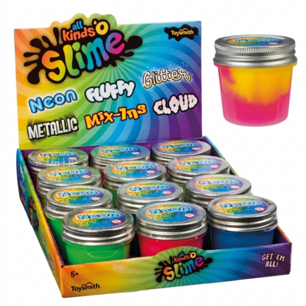 Toysmith All Kinds ‘O Slime Neon Slime comes in a 2.75-inch plastic jar to keep it contained when not in use and make it easy to grab, go, and play. With an assortment of two-toned neon color options, this vibrant putty slime is a favorite party favor and stress-reliever tool for at home, in the classroom, and in other settings. Color combinations vary but may be a mix of pink, yellow, blue, and green. Both colors mix for a special third color that changes hue as kids shape and reuse the slime. An assortment of 3 Neon Slimes come with a colorful 9.06 x 11.61-inch display case. Other Slime options available are Glitter, Fluffy, Metallic, Cloud, and Mix-Ins.
