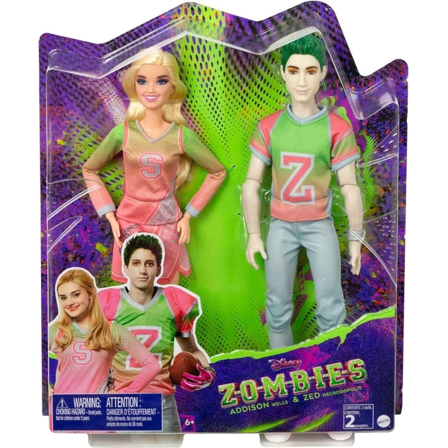 It's time to play with this favorite Disney Zombies duo! This 2-pack comes with Addison and Zed dolls (~12 inches) dressed in their iconic Seabrook High cheerleader and football player uniforms. For extra expressive play, they can stand on their own and have 11 flexible points of articulation at the neck, shoulders, elbows, wrists, hips, and knees. Dance, cheer, score a touchdown, or strike a pose! Fans will love playing out favorite movie moments with this Addison and Zed doll set. Go Mighty Shrimp, go! Colors and decorations may vary.