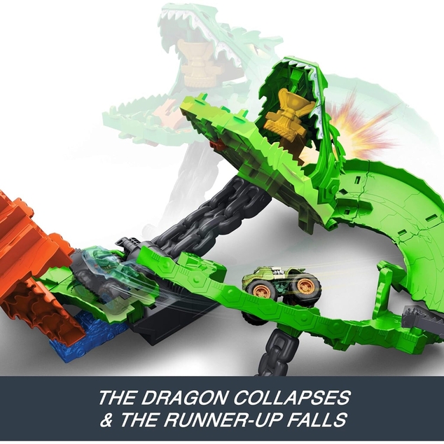 The race is on between Hot Wheels Monster Trucks Great Bite and Rageasaur to defeat the nemesis dragon in the Sharks vs. Dinos Dragon Destruction Playset. Load the included toy trucks into the double slam launcher, then send them racing side-by-side through the mouth of the cyborg dragon. They race down through the dragon's insides, where a chainsaw diverter randomly chooses if one of the trucks gets knocked off the track. Once the dragon collapses, kids can launch the victorious truck into its mouth and claim the trophy. Two 1:64 scale Hot Wheels Monster Trucks are included. Colors and decorations may vary.