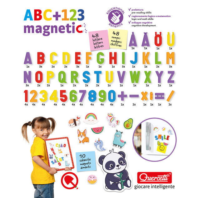 This Quercetti ABC 123 Magnetic set includes 48 letters, 48 magnetic numbers, and 10 additional magnets, offering versatile tools to support early learning.
