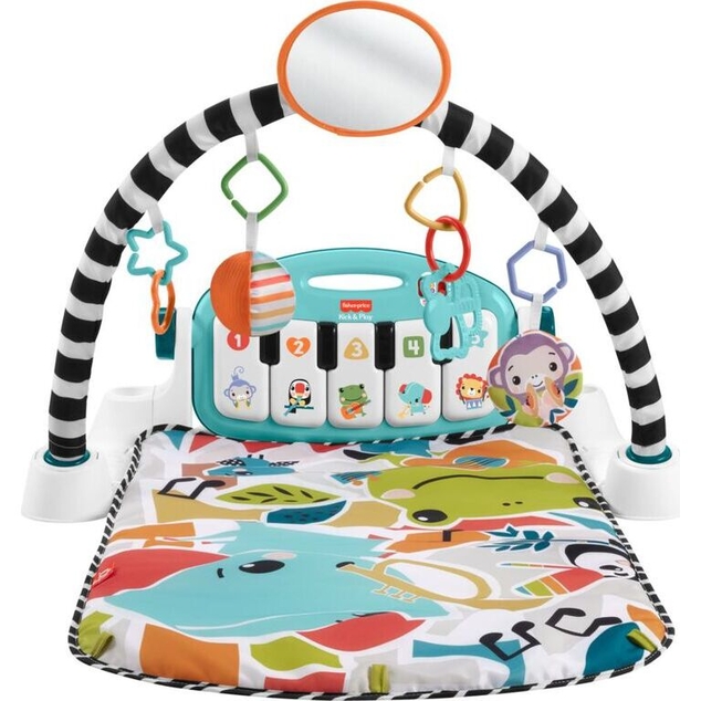 Get your little one moving, grooving (and learning) with the Glow and Grow Kick & Play Piano Gym from Fisher-Price. This soft baby activity mat features a repositionable high contrast toy arch with 10 linkable toys. The removeable piano with 5 light up keys features a multi-colored light show and has 4 musical settings that grow with baby from newborn to toddler. With 3 Smart Stages learning levels, and a bonus freestyle mode with real piano notes, you can keep things fresh and fun as your little virtuoso goes from lay and play and tummy time to sitting up and making music!