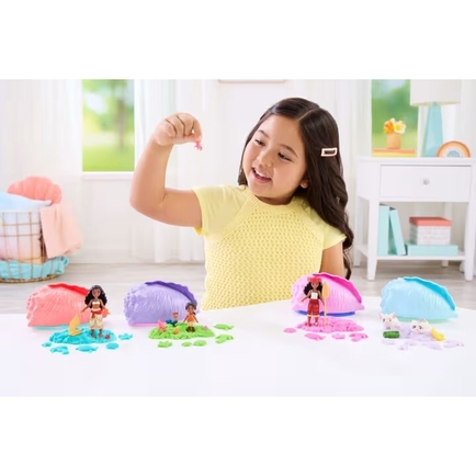 Ocean-themed surprises are magically revealed in these Disney Moana small doll sets hidden in an array of colorful shells! Open the shell to discover a Disney Moana small doll or pair of animal friends, inspired by animated characters in the Disney movie. Colorful moldable sand and three surprise accessories extend the storytelling fun. Kids can use sand molds in the shell base to make an island and display their characters and accessories. Each sold separately, subject to availability. Dolls cannot stand alone. Colors and decorations may vary.