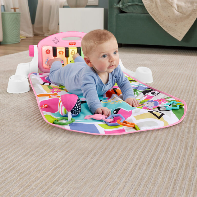 Get your little one moving, grooving (and learning) with the Glow and Grow Kick & Play Piano Gym from Fisher-Price. This soft baby activity mat features a repositionable high contrast toy arch with 10 linkable toys. The removeable piano with 5 light up keys features a multi-colored light show and has 4 musical settings that grow with baby from newborn to toddler. With 3 Smart Stages learning levels, and a bonus freestyle mode with real piano notes, you can keep things fresh and fun as your little virtuoso goes from lay and play and tummy time to sitting up and making music!