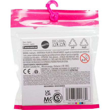 The pack includes 5 pairs of shoes in a mix of styles and bright colors! Shoes fit most Barbie doll body types.