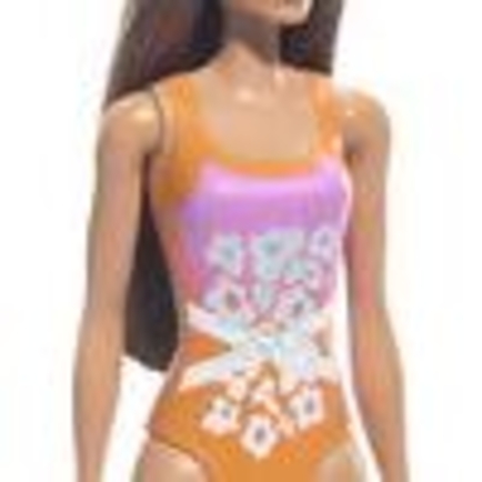 This Barbie doll wears a molded pink and orange ombre swimsuit with a tropical flower design.