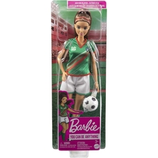 Barbie soccer doll also has a brunette ponytail and comes with a soccer ball accessory.
