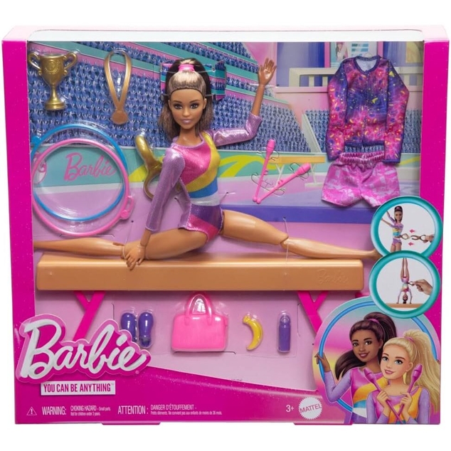 Kids will flip for this Barbie gymnastics playset with fashion doll, flipping feature and more than 10 accessories for fan-favorite events! Imaginations can create routines for the floor or balance beam and execute air moves with the c-clip mechanism -- simply snap onto the doll's waist for flips, cartwheels, jumps and more! Additional storytelling pieces includes batons, hoops, a trophy and a warm-up suit to really heat up the competition. With so much play opportunity, the Barbie doll and set makes a great gift for kids 3 years old and up. Doll cannot stand or flip alone. Colors and decorations may vary.