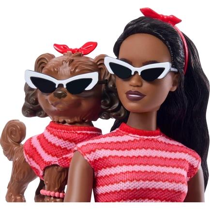Barbie doll and her puppy perfectly match in wavy red stripes! Barbie wears white sneakers and a two-piece set with a knotted tie detail that is a mirror image of the tie on her puppy's top!