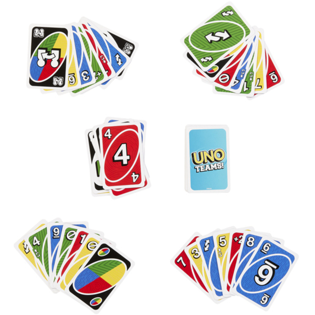 UNO Teams is the classic game you know and love, now played in teams of two. Players work together to match colours, numbers, and symbols