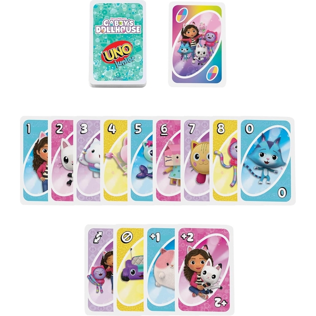 For totally a-meow-zing fun, play UNO Junior Gabby's Dollhouse card game! With a deck featuring paw-sitively adorable graphics inspired by Gabby, Pandy Paws and other favorite characters from the show, players try to match colors and numbers with every turn. It has three levels beginner, intermediate and advanced -- to match a child's level of play. And when down to a last card, don't forget to meow 'UNO!' Makes a fun gift for Gabby's Dollhouse fans and card game lovers ages 3 years old and up. Colors and decorations may vary.