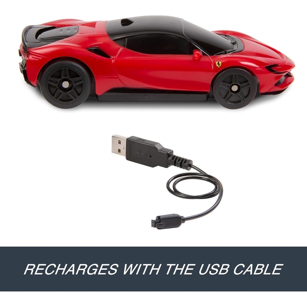 The Hot Wheels RC 1:64 scale Ferrari SF90 operates on a 2.4 GHz frequency to prevent interference when racing other remote-control cars.