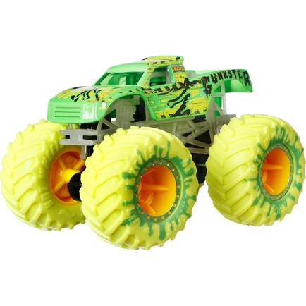 With 10 vehicles together, this set of Hot Wheels Monster Trucks Glow in the Dark is an instant collection! Five die-cast monster trucks and five 1:64 scale die-cast cars provide endless smashing and crashing play -- with the lights on or off! Glow-in-the-dark elements bring a new edge to 'light speed.' Kids can collect other Monster Trucks vehicles and toys for even more stunting, racing and battling play! Makes a great gift for kids 4 to 8 years old, especially monster trucks fans! Colors and decorations may vary.