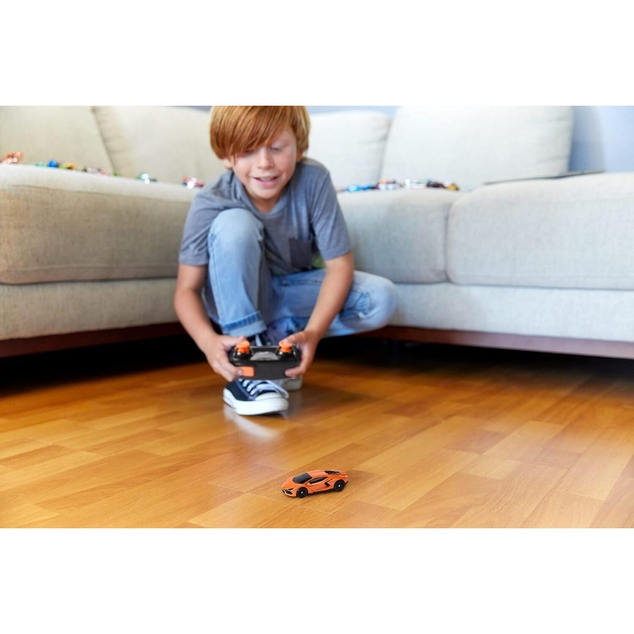 Hot Wheels RC puts kids and collectors in control of their very own Lamborghini Revuelto. This 1:64 scale version of the elite sports car has full-function remote control operation and authentic details that Lamborghini fans love. Drive it on or off Hot Wheels tracks, where it can dominate loops and outrace opponents, and hit the turbo boost button for extra speed when executing stunts! Colors and decorations may vary.