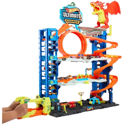 Explore all four levels of racing, stunting and storytelling in the Hot Wheels City Ultimate Garage just like the kids in the Netflix series 'Let's Race'. Each level inspires track-play adventures including side-by-side racing, loop stunts and an epic battle with a car-eating dragon. The set comes with two Hot Wheels vehicles and has enough parking for more than 50 1:64 scale toy cars. It also connects to other sets so kids can build out their Hot Wheels City. Additional sets sold separately. Colors and decorations may vary.