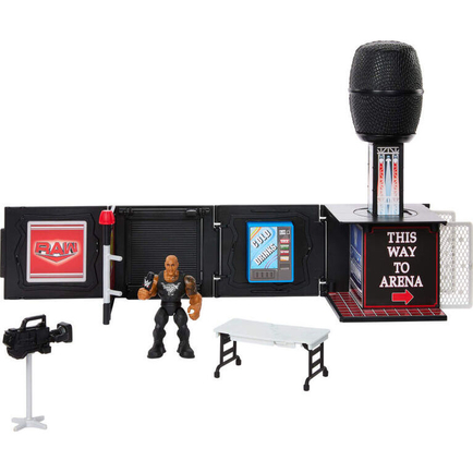 Discover behind-the-scenes mayhem in the WWE Knuckle Crunchers The Rock Final Boss Microphone playset with action figure, 2 accessories and breakaway destruction!