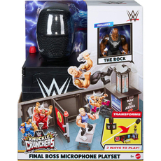 Bring the WWE mayhem backstage with 2-in-1 Knuckle Crunchers The Rock Final Boss Microphone playset with action figure, two accessories and breakaway action! The kid-sized microphone flips open into a backstage diorama for play and display. The Rock is ready to dominate the airwaves standing 3.25 inches tall with joints that make bone-crunching sounds when moved. A breakaway table and camera add to the action on set. With a fist full of fighting accessories, bone-crunching sounds and breakaway action, this set delivers the crunch for fans and kids ages 6 years and older. Colors and decorations may vary.