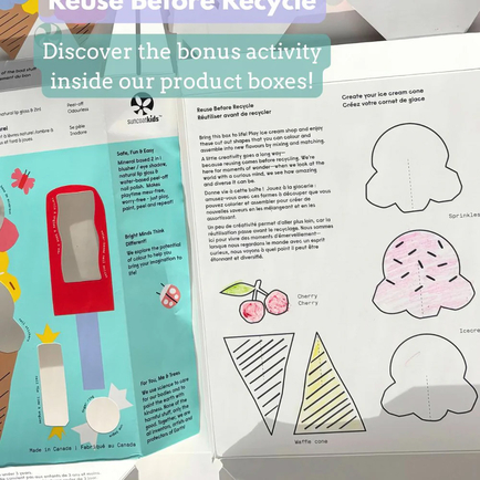 Bonus activity, bring the box to life! Play ice cream shop and enjoy these shapes that you can colour and assemble into new flavours by mixing and matching.