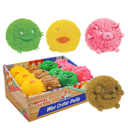 Small and lightweight, these cute roly-poly animal character squish balls create a playful relaxed mindset and engage the brain and body. Each set of 24 critters features 4 unique animals, a pig, chick, hedgehog, and frog. 2.75-inch diameter air-filled ball with soft stretchy rubber strands that move and flow like fur.