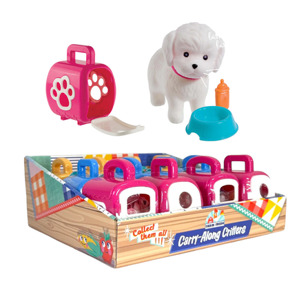 Farm Fresh Carry-Along Critters come in 4 animal styles, including a rabbit, kitten, hamster, or puppy dog. Each tiny animal figurine is made with nontoxic, high-quality plastic and features soft round eyes. The dog and cat also wear colored collars. Each Bitty Buddies toy comes with its own brightly colored plastic carrying case and care accessories. Each case has a tiny handle at the top and a white door that swings open and close. Pet-carrying cases are blue, pink, or orange. Included accessories vary but may include a small pink bowl, as well as either a bottle or bone. Get an assortment of 12 with a colorful display case.