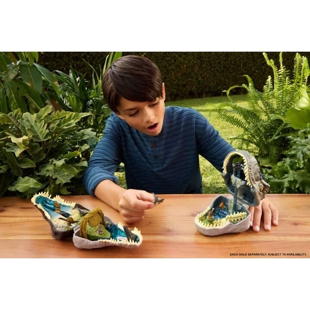 Bring home the thrills and adventure of Jurassic World Rebirth, and take them along with you anywhere, with a Micro Adventure playset! Open up the playset shaped like a dinosaur head to reveal a miniature world of fun. With 3 figure-activated features and 6 included micro figures, this is a dinosaur lover's dream. The figures fit securely on pegs throughout the environment that's inspired by the movie. The toy set folds up neatly so it can be taken along for travel or kept packed up at home ready for playtime.