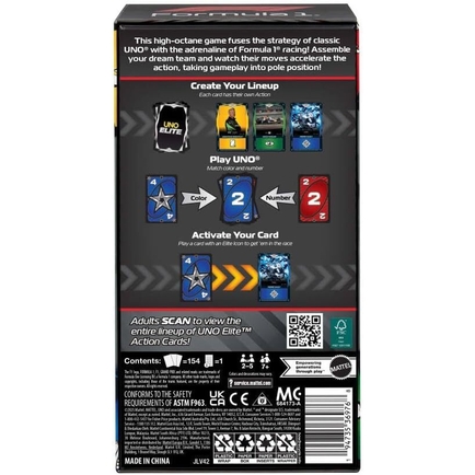 Race into game night with the UNO Elite Formula 1 2025 Core Edition card game where Elite Action Cards add extra thrills to classic UNO game play!