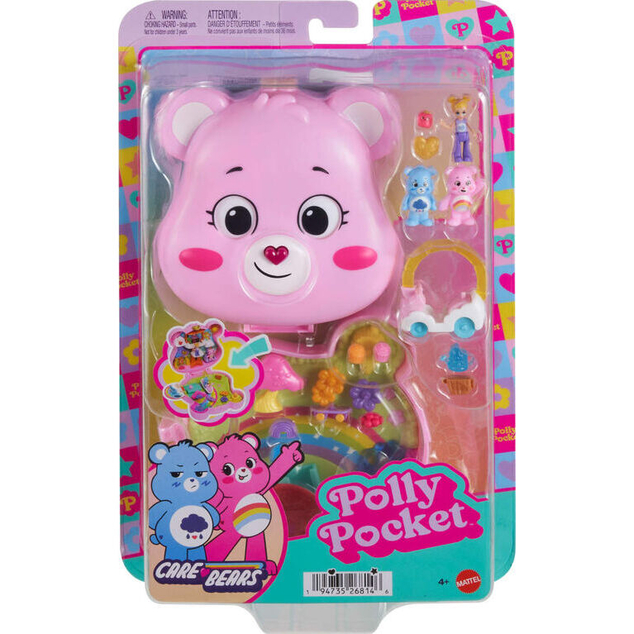 Care Bears go micro with Polly Pocket in this adorable partnership compact with Polly and Care Bears dolls! The Care Bears exterior with a winking eye fidget opens to Care-a-Lot, a land of sunshine and rainbows, where kids can play all day. There's so much to do with three micro dolls and themed accessories including the iconic Rainbow Roller car! Polly doll loves to check out the view from a cozy cloud chair. Care Bears dolls can go for a picnic in the park or take turns going up the treehouse lift to play alongside Polly doll in the clouds. This collectible playset is ideal for Polly Pocket and Care Bears fans alike, ages 4 years old and up. Subject to availability. Colors and decorations may vary.