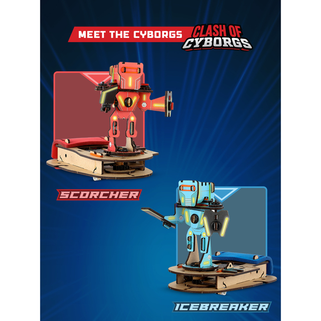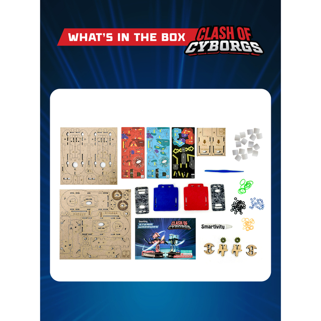 SMARTIVITY: CLASH OF CYBORGS - Enter an action-packed realm of cyborgs and epic battles with this exciting kit! Your child will have the chance to construct 2 powerful cyborgs along with their controllers, creating a dynamic showdown right at home.