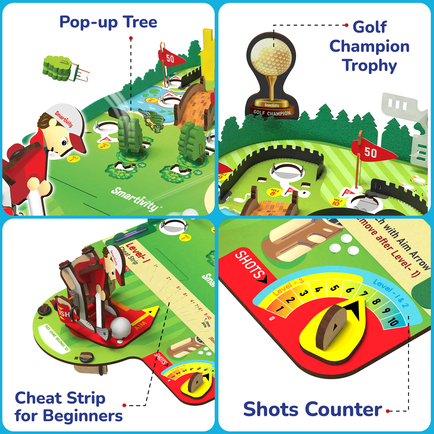 Hit the 'Tree Poppers' to make them fly. A cheat sheet is provided for beginners and a golf trophy for champions.