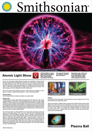 Enjoy an incredible atomic light show at your fingertips with the Smithsonian Plasma Ball. Watch what happens when atoms collide with each other and energize electrons as your fingertips control light effects. Observe how colliding atoms release energy in the form of light waves! The plasma ball also responds to sound and music and comes packaged with STEM educational content.